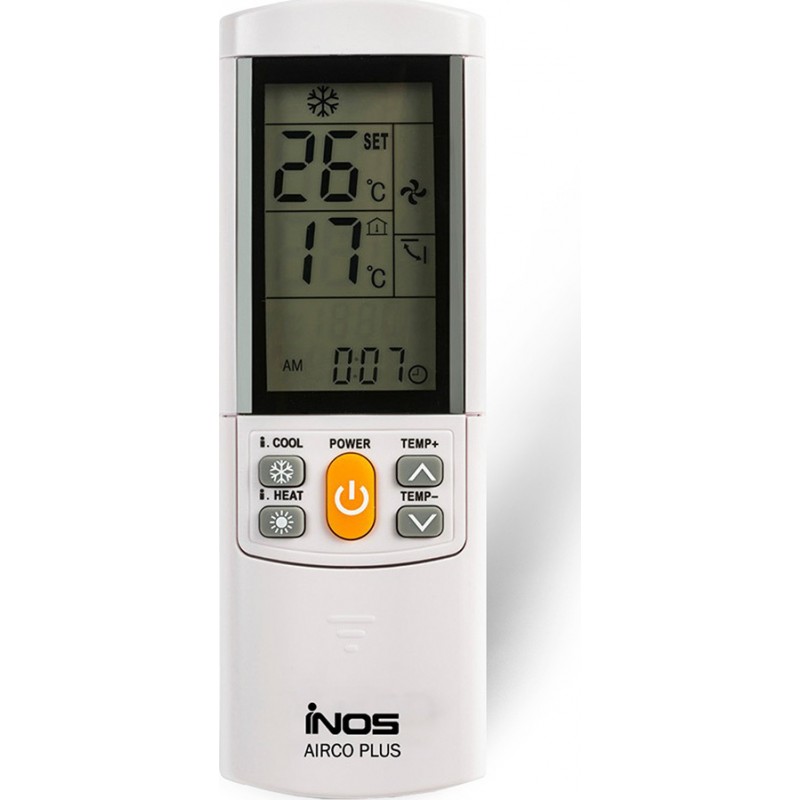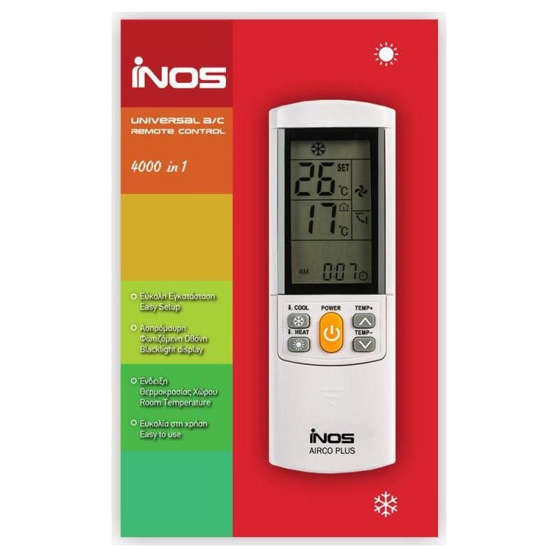 Universal Τηλεχειριστήριο inos AIRCO PLUS 4000 in 1 για κλιματιστικά συμβατό με 4000 μοντέλα και δύο προγράμματα: manual & αυτόματο. Περιλαμβάνει όλες τις κύριες λειτουργίες του αρχικού τηλεχειριστηρίου σας συμπεριλαμβανομένου της λειτουργίας Cool & Hot για έξυπνη ψύξη & θέρμανση του χώρου μέσω 2 ξεχωριστών πλήκτρων αλλά και δευτερεύουσες λειτουργίες όπως χρονοδιακόπτη, ρολόι, sleep mode, θερμοκρασία δωματίου, ανεμιστήρα, ρύθμιση ταχύτητας αέρα & swing. Επιτρέπει ταυτόχρονη προβολή ενδείξεων ρυθμιζόμενης θερμοκρασίας και θερμοκρασίας δωματίου ενώ διαθέτει συρόμενο κάλυμμα για τις επιμέρους λειτουργίες του τηλεχειριστηρίου. Κομψή σχεδίαση με μεγάλα πλήκτρα και μεγάλη ευανάγνωστη φωτιζόμενη οθόνη. Δυνατότητα τοποθέτησης σε τοίχο χάρη στην βάση στήριξης που περιλαμβάνει η συσκευασία.